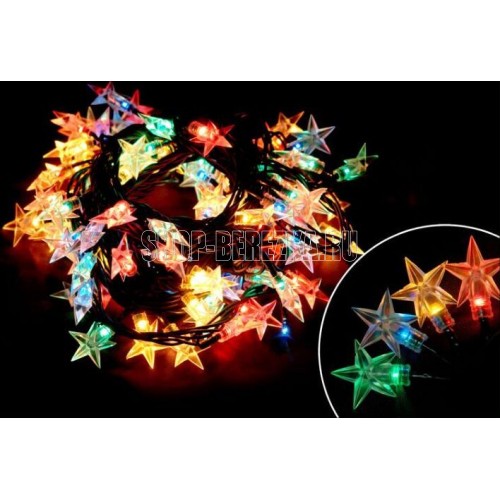 Электрогирлянда "Звезды" Star-100-5-MC. многоцветная. 100 рисовых ламп. длина рабочей части 5м. 8 режимов работы. орнамент - прозрачные звездочки. шнур зеленый. питание от сети 220-240В, 50 Гц. для использования внутри помещений, класс защиты IP20. мощность 31Вт. картонная коробка. ПВХ, алюминий, медь, лампы.