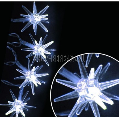 20 LED ламп, длина 280 см, режим свечения: постоянный, внутри помещения, Материал ПВХ, алюминий, медь, LED лампы. Диаметр орнамента 3,5см . Цвет: белый. IP 20 . Провод прозрачный. мощность 3,6Вт.