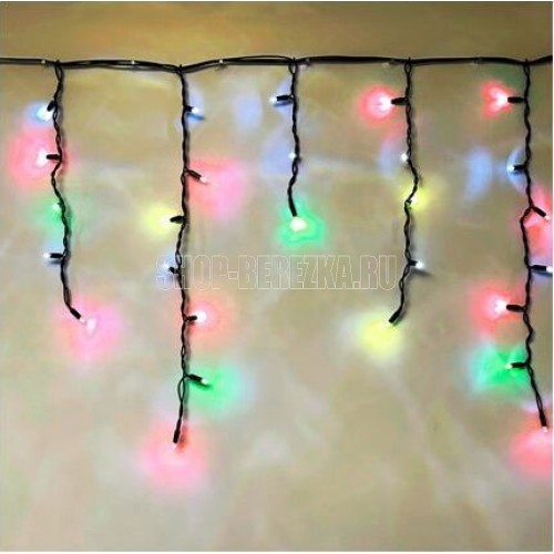 Гирлянда "Бахрома" - применяется для декорирования арок, фасадов, витрин. Представляет собой горизонтальный гибкий шлейф, от которого исходят вертикальные нити различной длины и действительно напоминает бахрому. Цвет свечения - мультицвет (синий, красный, зеленый и желтый). Размеры гирлянды - 3х0,7м. Длина шнура от вилки до начала гирлянды - 1,5м