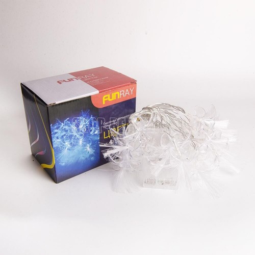 Ищете интерьерные украшения для дома Обратите внимание на гирлянду FUNRAY Цветы. Каждый из 20 цветков имеет красивую сердцевину из тонких нитей, кончики которых отражают синее свечение светодиода, спрятанного внутри. Светодиодную гирлянду можно использовать для украшения интерьера, оформления фотозоны, в качестве подарка. Она выглядит необычно, красиво и уютно. Удобно размещается в любом месте за счет питания от батареек. Длина гирлянды – 2.85 метра, на которых расположено 20 светодиодных цветков. Провод прозрачный. Цветы будто парят в воздухе