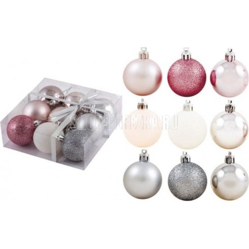 Набор шаров "Жемчуг". размер: 6 см. кол-во 9 шт (мат, глянец, блеск). цвет как на фото. материал: пластмасса, полиэстер. упаковка: ПВХ-коробка.