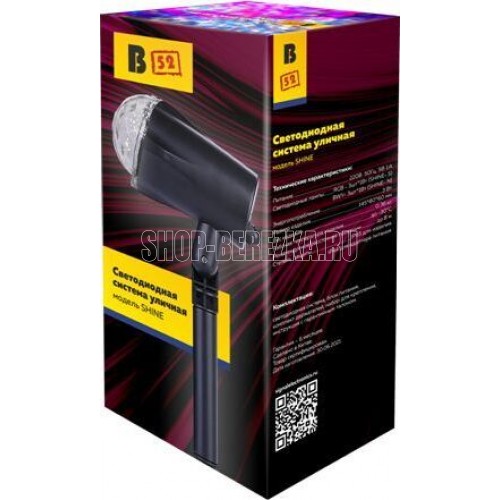B52 "SHINE-N" - уличная светодиодная система с проекцией абстрактного рисунка. 3 цвета свечения: синий/белый/желтый. Работает в атоматическом режиме. Разрешено эксплуатировать при температуре воздуха до -30°С. Длина шнура от вилки до системы - 3м.
