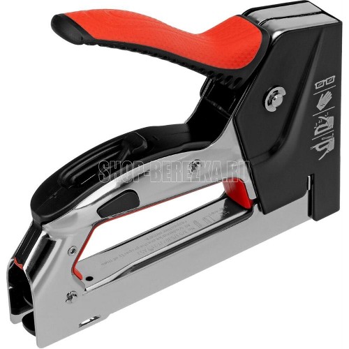 Стальной мебельный степлер Matrix PRO 40917 с механизмом быстрой загрузки скоб помогает быстро закрепить на деревянном основании фанеру, оргалит, ДВП, ДСП, ПВХ-пленку или теплоизоляционный материал с помощью скоб 53 размером 4-14 мм. Двухпозиционный регулятор силы удара позволяет устанавливать глубину забивания скобы в зависимости от твердости скрепляемых материалов. Инструмент подходит для сборки или обивки мебели, укладки ковровых покрытий, проведения ремонтных и отделочных работ.ПреимуществаПрочность — стальной корпус, изготовленный методом штамповки, устойчив к повреждениям.Долговечность — хромированное покрытие и порошковая эмаль защищают корпус от ржавчины.Быстрая подготовка к работе — механизм быстрой загрузки скоб экономит время мастера.Комфортная эксплуатация — эргономичная двухкомпонентная рукоятка с рельефным дизайном не скользит в руке.Продуманная комплектация — степлер поставляется с крючком для подвешивания на ремень.