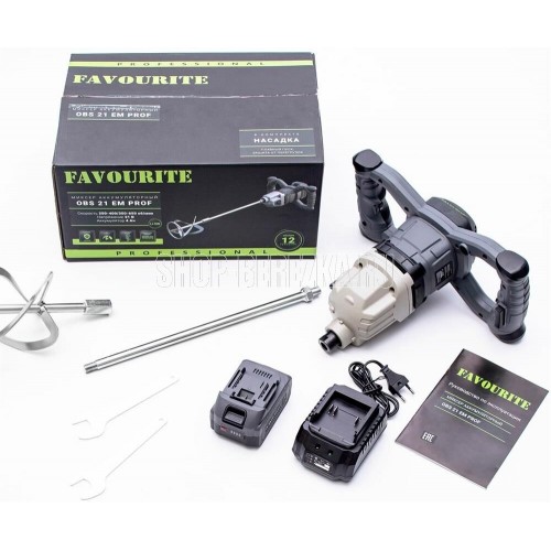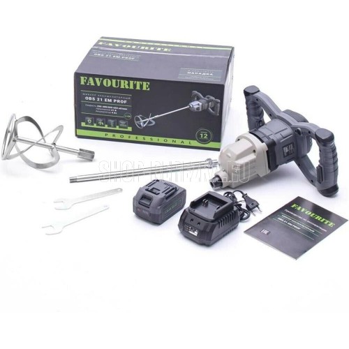 Аккумуляторный миксер FAVOURITE OBS 21 EM PROF, Li-ion, 21 В, 4 Ач, 250-400/350-650 об/мин, М-14, 120 мм, бесщёточный двигатель, плавный пуск. В комплекте: насадка, ключ, АКБ, ЗУ.