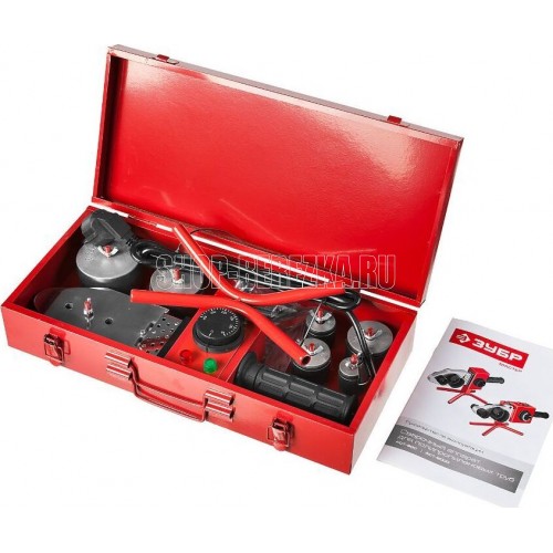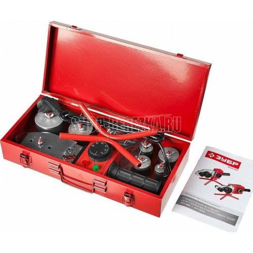 Сварочный аппарат для полипропиленовых труб, 800Вт, 50-300С, насадки 20, 25, 32, 40 , 50, 63мм, металлический кейс, 220В ЗУБР МАСТЕР АСТ-800 служит для проведения ручной сварки полипропиленовых труб и фитингов враструб. Подходит для использования в сфере бытовых и профессиональных работ. Прост и эффективен в применении. Технические характеристики Зубр МАСТЕР 800 Вт, 50- 300 С, насадки 20, 25, 32, 40 , 50, 63мм, 220В Напряжение, В 220 Покрытие греющих элементов тефлоновое Тип насадки насадка парная. Тип сварки муфтовая (раструбная). Диаметр насадки, мм 63 Вес, кг 1 Диаметр сварки, мм 63 .Мощность, Вт 800. Регулятор температуры. Форма нагревателя мечевидный.
