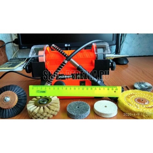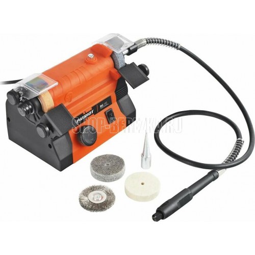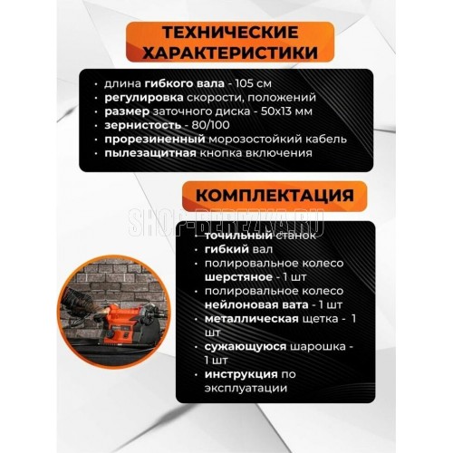 Длина гибкого вала, см 105, Пылезащитная кнопка включения, Потребляемая мощность, Вт 100, Посадочный диаметр, мм 12,7, Зернистость, круг левый/круг правый 80/100, Прорезиненный морозостойкий кабель, Регулировка скорости, положений, Посадочный диаметр диска, мм 12,7, Размер заточного диска, мм 50х13.