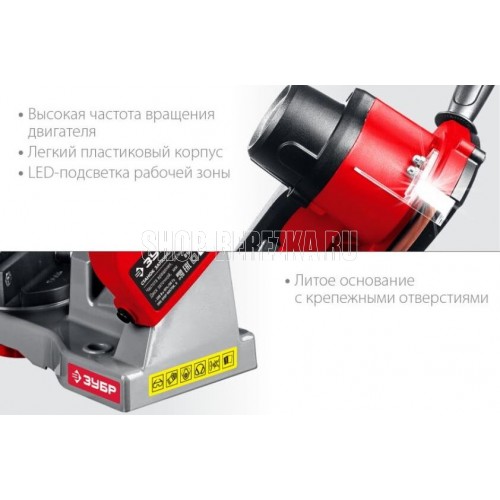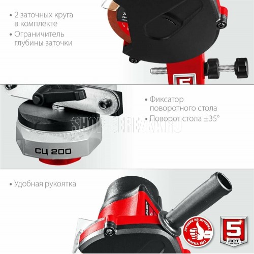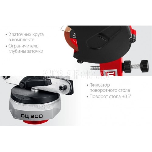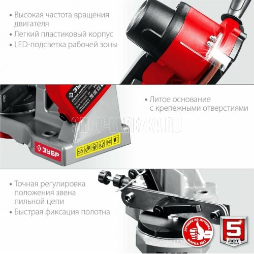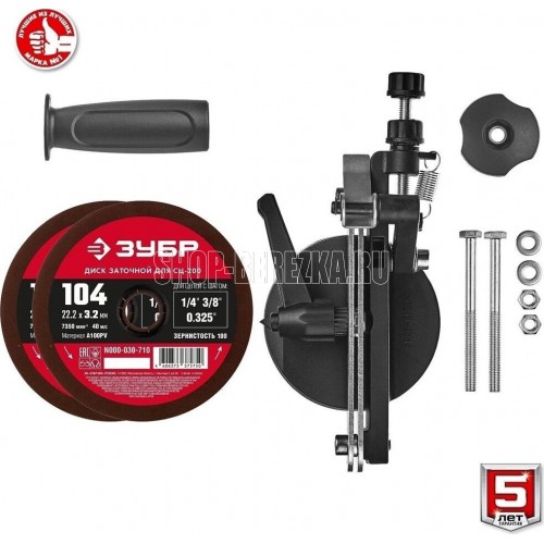 Станок точильный ЗУБР СЦ-200, предназначен для заточки пильных цепей следующих типов 1/4" (6.35 мм) 3.8" (9.3 мм) низкий профиль 0.325" (8.25 мм) Цепь ЗУБР тип 2 и тип 3 3/8" (9.3 мм) Цепь зубр тип 1 0.404" (10.26 мм). Мощность двигателя, Вт: 90. Тип электродвигателя: коллекторный. Напряжение, В: 230. Частота вращения шлиф. круга, об/мин: 5000. Размер заточного круга, мм: 104. Посадочный диаметр, мм: 22.2. Лампа подсветки: есть.