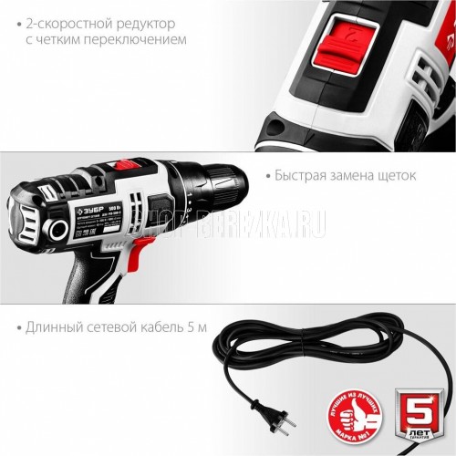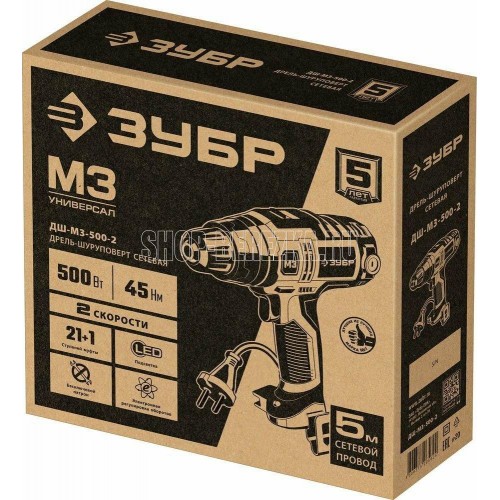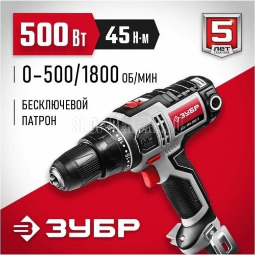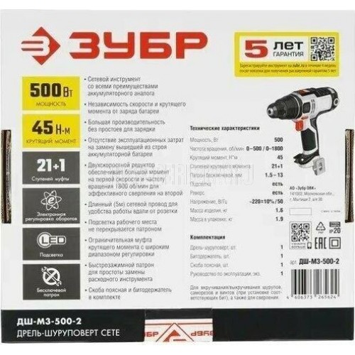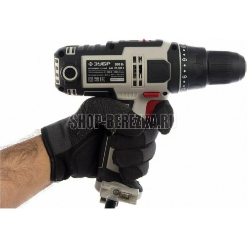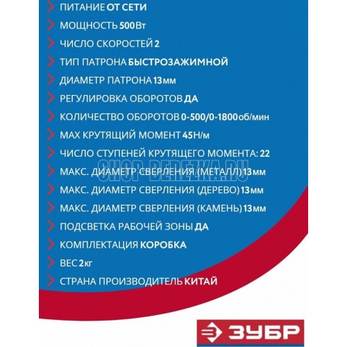 Мощность, Вт 500. Частота вращения шпинделя, об/мин 0-500/0-1800. Число скоростей2. Крутящий момент, Н*м 45. Число ступеней крутящего момента 21+1. Тип патрона бесключевой. Размер патрона, мм 1.5-13. Реверс. Быстрая замена щеток. Наличие подсветки. Блокировка шпинделя. Длина кабеля, м 5. Напряжение, В/Гц 220±10% /50. Габариты, см 26.5x7.5x24.5. Масса изделия, кг 1.6. Масса в упаковке, кг 1.95. Комплектация. Дрель-шуруповерт 1. Битодержатель 1. Скоба поясная 1. Руководство по эксплуатации 1.