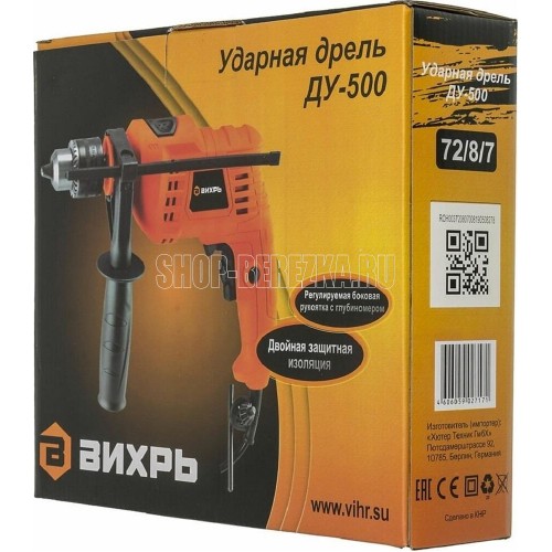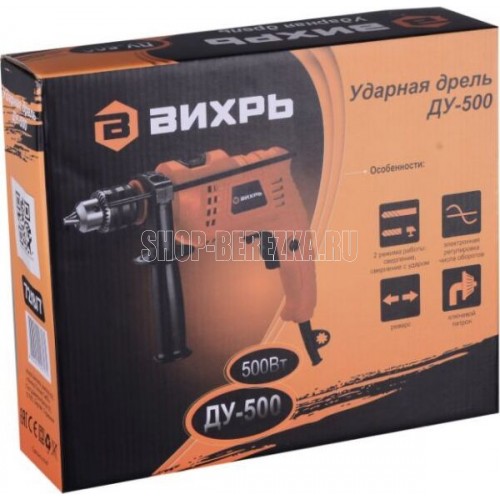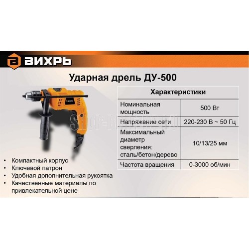 Мощность - 500Вт. Макс. обороты - 3000об/мин. Число ударов - 43000уд/мин. Диаметр патрона - 13мм. Тип патрона - ключевой. Макс диаметр сверления дерево/металл/бетон - 10/13/13мм. Электронная регулировка числа оборотов.