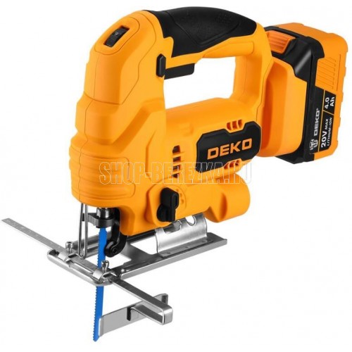 Лобзик аккумуляторный DEKO ; ;DKJS20E, 1x4.0Ah ;используется для распиливания дерева, металла, пластика, резины при отделочных или ремонтных работах. ;Наличие бесключевого патрона значительно облегчает замену полотна. ;Два режима маятникового хода позволяют ускорить работу. Подошва может наклоняться до 45 градусов в обе стороны. ; Характеристики:Напряжение: 20 ВЕмкость АКБ: 2000 мАчЧисло ходов: 800-2700 ход/минХод пилки: 19 ммМакс. глубина реза дерева: 65 ммМакс. глубина реза металла: 6 мм Комплектация:Лобзик – 1 штАКБ – 1 штЗарядное устройство – 1 шт ;Пильное полотно – 1 штПараллельный упор – 1 штШестигранный ключ – 1 штРуководство по эксплуатации – 1 шт