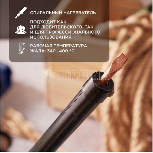 Электрический паяльник со спиральным нагревателем (ЭПСН) питается напрямую от сети 220 В, рабочая темпа рабочего стержня 340...400 °С, время разогрева до рабочей темп — 7 мин., класс защиты — II. Размеры жала: Диаметр: 4,5 мм. Длина: 67 мм. Габаритные размеры без шнура: 250x24x24 мм.