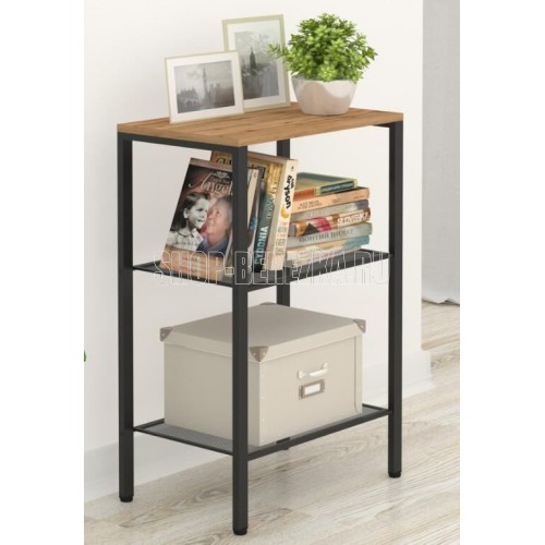Изделие предназначено для хранения домашних и офисных предметов. Представляет собой стеллаж с 3 полками, выполненными из просечно-вытяжного листа и верхней полки из ЛДСП. Разборный каркас состоит из стальной профильной трубы 15х25 мм. В комплект входят регулируемые пластиковые опоры. Все изделие окрашено однотонной, порошковой краской. Допустимая нагрузка на полки до 8 кг.