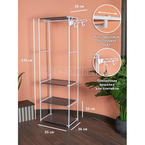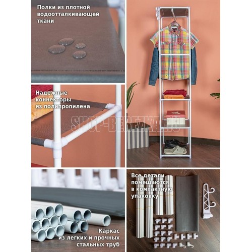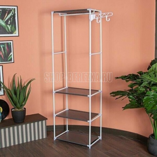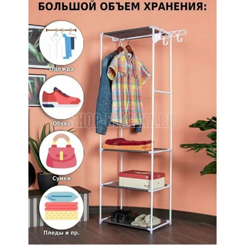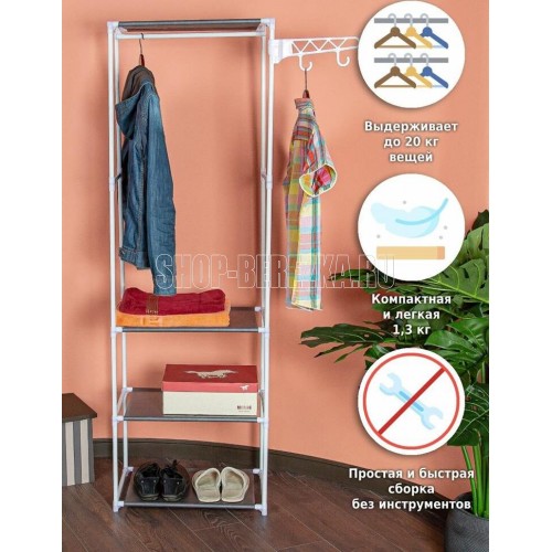 Простая и легкая напольная вешалка с крючками позволит хранить все необходимые вещи рядом. Вмещает в себя большое количество вещей, позволяя грамотно вписать ее в любое пространство. Специальные передвижные крючки можно использовать для хранения сумок, шапок, а также мелких аксессуаров. Передвижные крючки вешалки поворачиваются на 360 градусов. Размеры в собранном виде: 55*36*170 см Материал: Металлическая труба 16*0,2 мм, полипропилен, нетканое волокно Цвет трубы: белый Цвет ткани: серый Количество полок 3 Максимальная нагрузка: 20 кг Вес нетто штуки: 1,2 кг Вес брутто штуки: 1,5 кг Размеры индивидуальной упаковки: 52*21,5*7 см Размеры транспортной коробки: 54*37*44 см Количество в транспортной коробке: 10