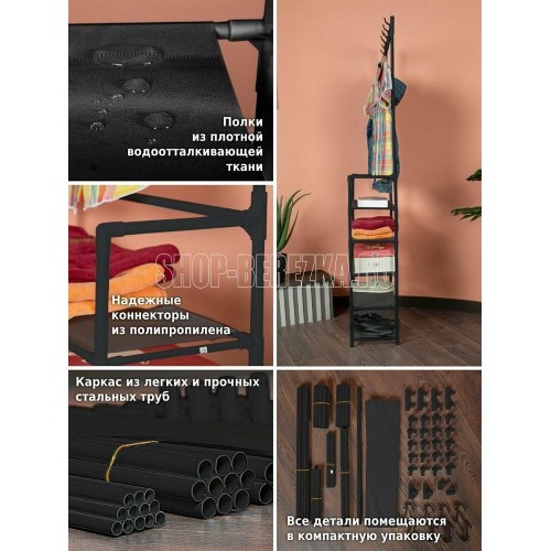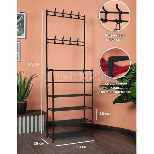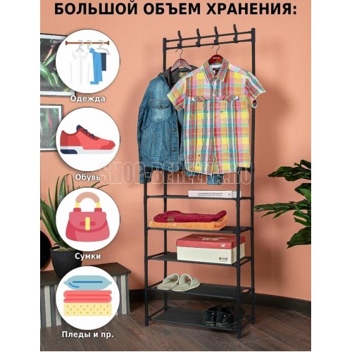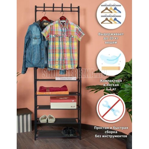 Напольная вешалка с крючками и полками для обуви подойдет к любому интерьеру. С помощью нее вы сможете удобно хранить верхнюю одежду, вещи и обувь. В комплекте идут 8 пластиковых крючков , которые легко крепятся к штангам вешалки вверху . Полки из нетканого материала. Размеры в собранном виде: 170*26*60 см Материал: Металлическая труба 16*0,2 мм, нетканое волокно Цвет трубы: черный Цвет ткани: черный Количество полок: 5 Максимальная нагрузка: 20 кг Вес нетто штуки: 1,3 кг Вес брутто штуки: 1,6 кг Размеры индивидуальной упаковки: 59*19*6,5 см Размеры транспортной коробки: 61*32*41 см Количество в транспортной коробке: 10