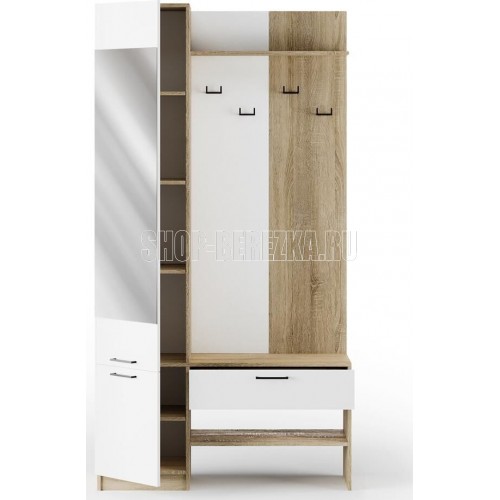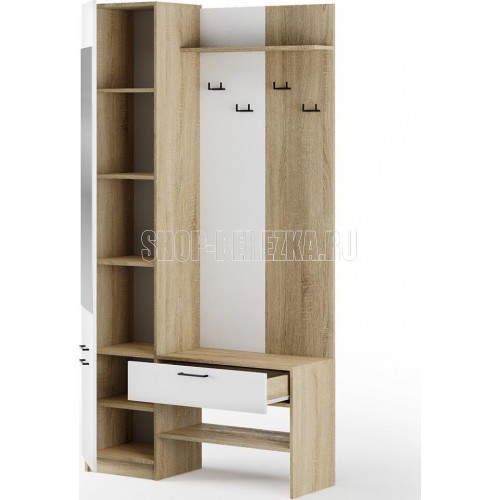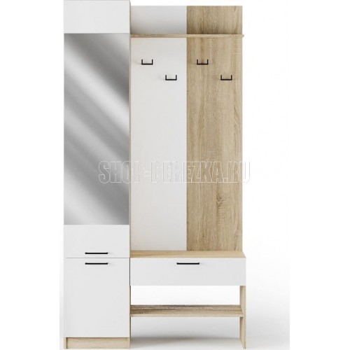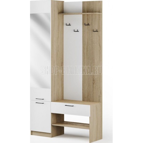 Компактная, но очень вместительная прихожая станет отличным вариантом для небольшого помещения. Стильный дизайн и высокая функциональность - два её главных качества.Закрытый шкаф оснащен двумя крючками для одежды, зонтов и сумочек. Внизу располагаются два вместительных отделения с полками для обуви. А в выдвижном ящике под зеркалом удобно хранить ключи, перчатки или средства для ухода за обувью. Возможна сборка на правую и левую сторону.Материал каркаса: ЛДСП дуб сонома Материал фасадов: ЛДСП белый, зеркало. Ручки: пластик В*Г*Ш 2100*350*1100 мм