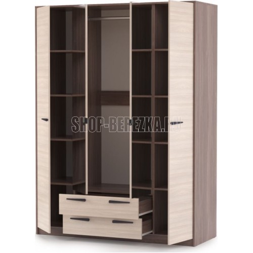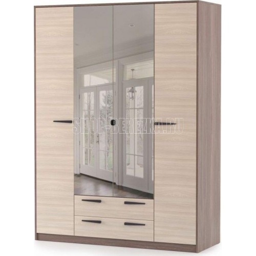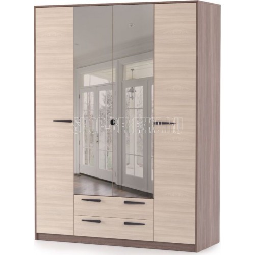 Шкаф 4-х створчатый Оптима - удобная и практичная система хранения вещей в спальной комнате, детской или гостиной. Модель в сочетании декоров светлого и темного дерева имеет спокойные четкие линии и формы, отлично впишется в любой интерьер, наполнит его уютом и подчеркнет стиль и вкус хозяев дома. Шкаф функционален и вместителен, для каждой вещи найдётся своё место: -два боковых пенала с полками для текстиля; -посередине, за зеркальными дверцами, установлена штанга для хранения одежды; -внизу в центре - выдвижные ящики. Шкаф можно дополнить другими элементами коллекции Оптима: комодом, прикроватными тумбами, тумбой под ТВ и т.д. Материал каркаса: ЛДСП шимо темный Материал фасадов: ЛДСП шимо светлый, зеркало Ручки: пластик Направляющие ящиков: роликовые Коллекция Оптима Ширина 1 571 Высота 2 110 Глубина 575 Цвет фасадов Шимо светлый Цвет каркасов Шимо темный Материал фасадов ЛДСП Материал каркасов ЛДСП Тип мебели Шкаф Срок службы (мес.) 120 Гарантия (мес.) 24