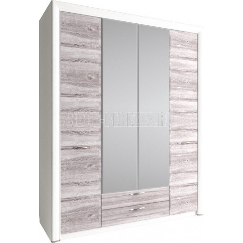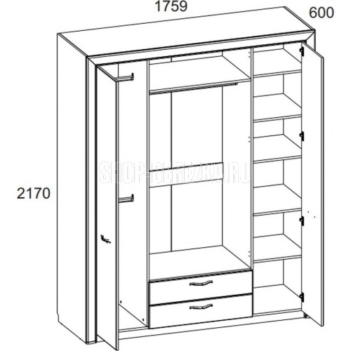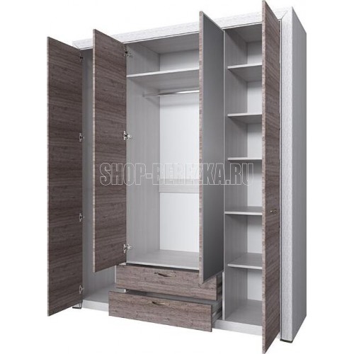 Функциональный и вместительный шкаф 4D2S коллекции Оливия для спальни. Имеет четыре двери (4D), дополнительную комодную секцию – два выдвижных ящика (2S). Шкаф Оливия 4D2S прямой, дверцы распашные, крепятся на петлях к боковым и внутренним перегородкам. Одно отделение для одежды с двумя штангами, одно отделение для одежды с одной штангой, отделение с глубокими полками для белья и других предметов одежды. Сверху расположена глубокая и вместительная ниша для хранения головных уборов. Основные характеристики: - Фасады: ЛДСП (18 мм) – Дуб анкона. - Металлические ручки (сплав цинка и алюминия). - Декоративные планки с патиной. - Шариковые направляющие полного выдвижения. - Зеркало с фацетом (декоративный срез).Характеристики: Коллекция Оливия. Размеры: ШхВхГ (1759х2170х600)мм. Материал ДСП ламинированная/МДФ/Зеркало. Вес_176.9 Наличие штанги: Да. Срок службы 5 лет. Страна происхождения: Республика Беларусь. Ручки NOMET (Польша), металл.