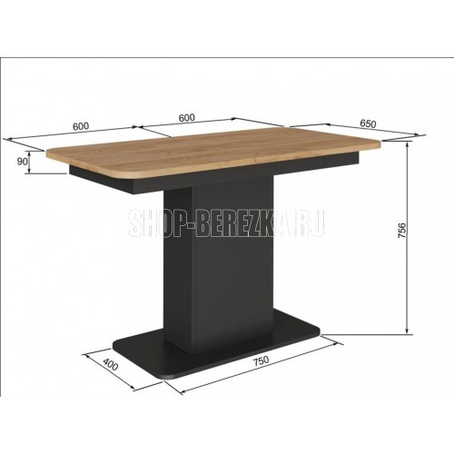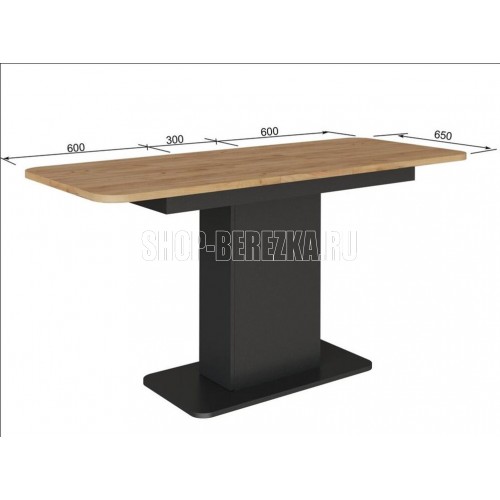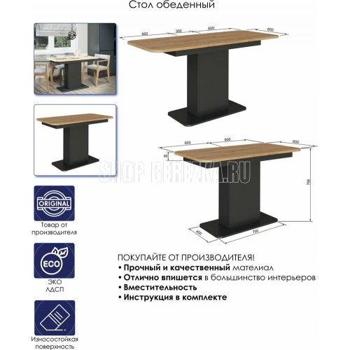 Обеденный стол раскладной, на одной опоре, столешница – ЛДСП 22мм. В сложенном виде столешница имеет размер 650х1200, в разложенном – 650х1500. Ширина 1 200 Глубина 650 Материал фасадов ЛДСП Материал каркасов ЛДСП Срок службы (мес.) 120 Гарантия (мес.) 24