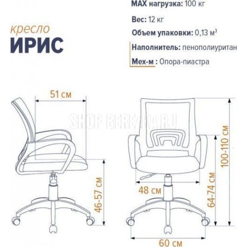 Крестовина: «Паук»600 мм. Подлокотники: пластик. Обивочные материалы: ткань серии «TW».Газпатрон: стандартный . Механизм: Топ-Ган (мезханизм качания с регулировкой жесткости и фиксацией в рабочем положении)/ Опора-пиастра. Ролик: пластик Размеры: В 1000-1110 Ш 480 Г 510 Габариты: Размеры коробки: 615/330/615 мм. Объем коробки: 0.13 куб. м. Вес: 12кг.