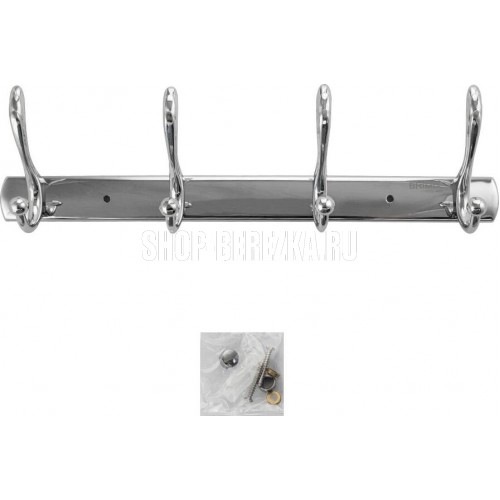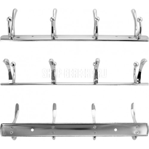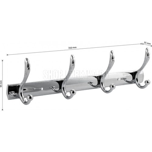 Вешалка - держатель для принадлежностей, металлический, хромированный, с четырьмя двойными крючками. Изготовлен из прочной нержавеющей стали марки SUS 304 с хромированным покрытием, которое придает безупречный стильный вид и долговечность. Хромированное покрытие очень стойко переносит истирания и обеспечивает зеркальный блеск изделия. На держателе с легкостью можно размещать вещи для сушки или вешать, как полотенца, так и одежду перед походом в душ. Идеально подойдет не только для ванной, но и для кухни, а также для дачи или гаража - при необходимости на держатель можно вешать любые предметы. Изделие крепится к стене с помощью дюбелей и саморезов (входят в комплект). Габаритные размеры: длина 350 мм, высота 95 мм, глубина 55 мм. Вес - 0,400 кг, объём - 0,00133 м3.
