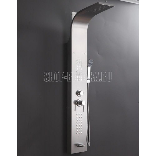 Ультрамодная дизайнерская гидромассажная душевая панель - "тропический душ" с двумя лейками и форсунками, 5 режимов работы, с коротким изливом. Функциональность обеспечивают тропический, верхний каскадный душ, ручная лейка и форсунки для массажа спины. Эффектный внешний вид и практичность эксплуатации придает изделию из нержавеющей стали марки 304 матовая хромированная поверхность. Сочетание эстетики и максимального комфорта достигается за счет интегрированных гидромассажных форсунок и встроенного верхнего душа. Стильное и компактное оборудование предназначено для установки в ванну или любую душевую зону. Душевая панель позволит проводить оздоровительные процедуры в домашних условиях, гидромассажные форсунки окажут мягкое терапевтическое воздействие. Габаритные размеры: высота 1500 мм, ширина 220 мм, глубина 75 мм, длина верхнего душа 500 мм, длина излива 80 мм, длина шланга 150 см. Вес - 9,000 кг, объём - 0,16000 м3. Комплект: корпус / крепления / лейка / держатель для лейки / душевой шланг / излив / переключатель потоков / соеденительные шланги.