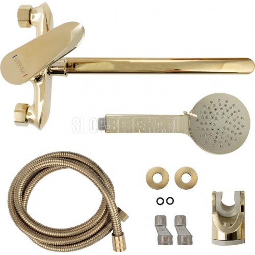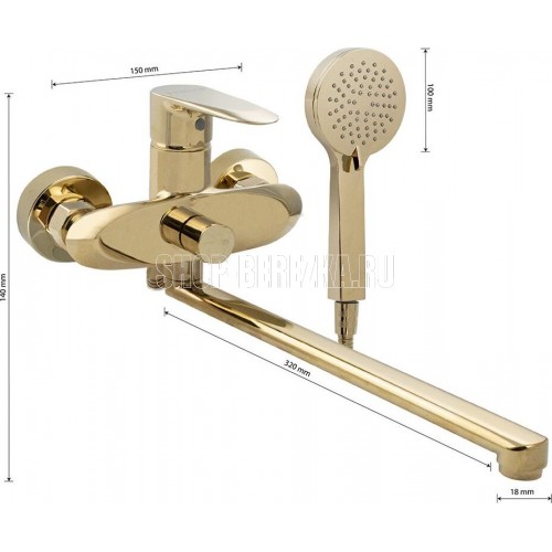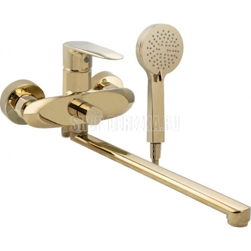 Смеситель в ванную / душевую комнату, латунный корпус под цвет ЗОЛОТА, с длинным плоским изливом, шаровый, с дивертором м/к на корпусе. Картридж d = 35 мм, литая ручка, аэратор для экономии воды, чашки и эксцентрики. Габаритные размеры: ширина 150 мм, высота корпуса 140 мм, длина излива 320 мм, круглая двухрежимная душевая лейка d = 100 мм, шланг 150 см. Вес - 2,300 кг, объём - 0,00864 м3. В комплекте паспорт, корпус с изливом, дивертор, душевая лейка, шланг, кронштейн, комплект крепежа и прокладок.