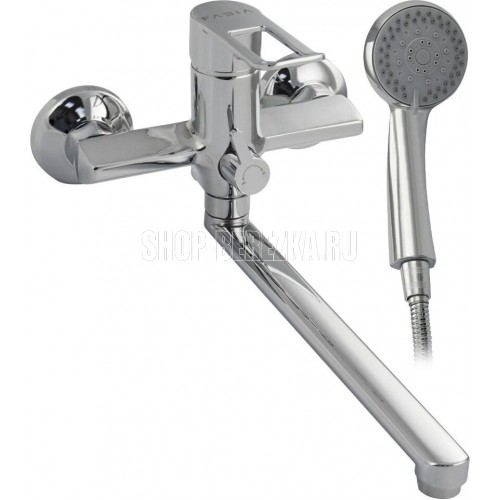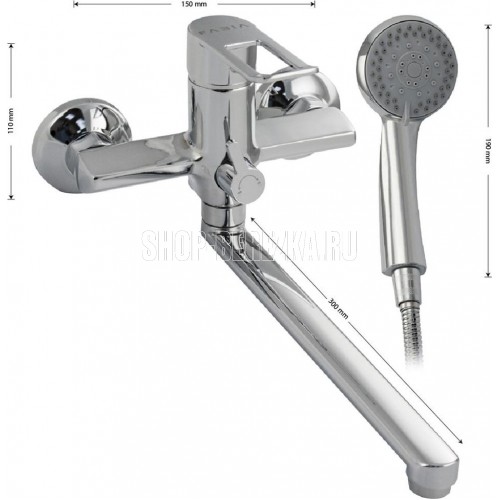 Смеситель хромированный в ванную / душевую комнату с длинным, плоским изливом, тяжёлый, массивный корпус, шаровый, с дивертором м/к на корпусе. Материал изготовления — ЦАМ (цинк-алюминий-медь) + нержавеющая сталь. Картридж d = 35 мм, плоская ручка с декоративным вырезом, аэратор для экономии воды, чашки и эксцентрики из нержавеющей стали. Габаритные размеры: ширина 150 мм, высота корпуса мм, длина излива 300 мм, душевая лейка 3 режима мм, шланг 150 см. Вес - кг, объём - 0, м3. В комплекте паспорт, корпус с изливом, дивертор, душевая лейка, шланг, кронштейн, комплект крепежа и прокладок.