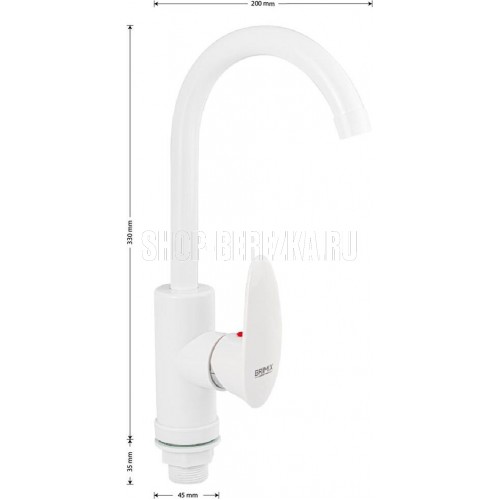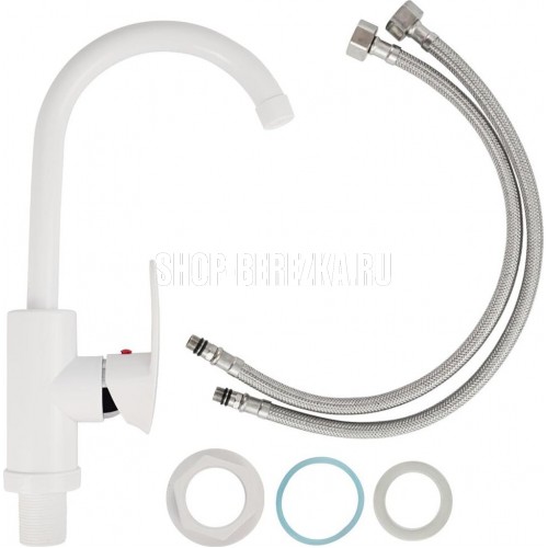 Смеситель для кухонной мойки и раковин, из высокопрочного пластика АБС, БЕЛЫЙ, боковой, с высоким С-образным изливом, шаровый. Крепление резьба - гайка, картридж d = 40 мм, литая ручка. Хромированный аэратор для экономии воды. Габаритные размеры: высота 330 мм, длина 200 мм, диаметр посадочного седла 45 мм, длина резьбы 35 мм, длина подводки 450 мм. Вес - 0,7 кг, объём - 0,00528 м3. В комплекте паспорт, корпус с изливом, пластиковая подводка с латунными штуцерами 1/2, крепеж, набор прокладок.
