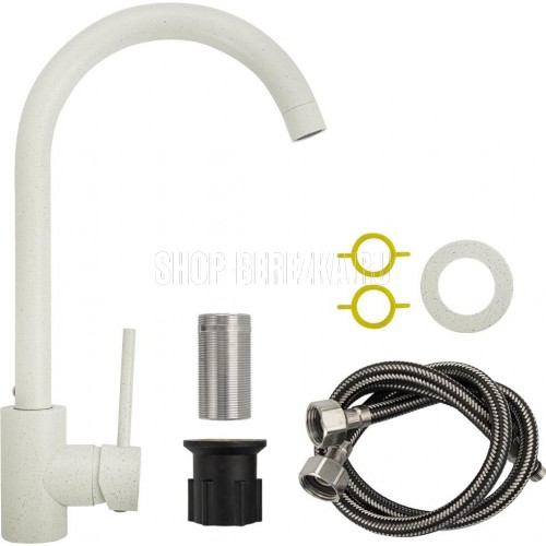 Смеситель для кухонной мойки и раковин, литой матовый корпус, из нержавеющей стали марки 304, с высоким С-образным изливом, шаровый. Цвет белая эмаль с вкраплениями. Крепление резьба - гайка, картридж d = 35 мм, ручка литая. Аэратор для экономии воды. Такая модель может использоваться на домашней кухне, на даче, в медицинских учреждениях и общественных местах. Габаритные размеры: высота 330 мм, длина 220 мм, диаметр посадочного седла 40 мм, длина резьбы 450 мм, длина подводки 450 мм. Вес - 1.38 кг, объём - 0.0055 м3. В комплекте паспорт, корпус с изливом, подводка 1/2, крепеж, набор прокладок.