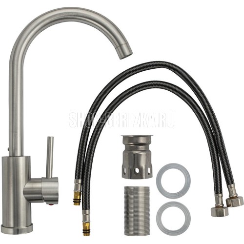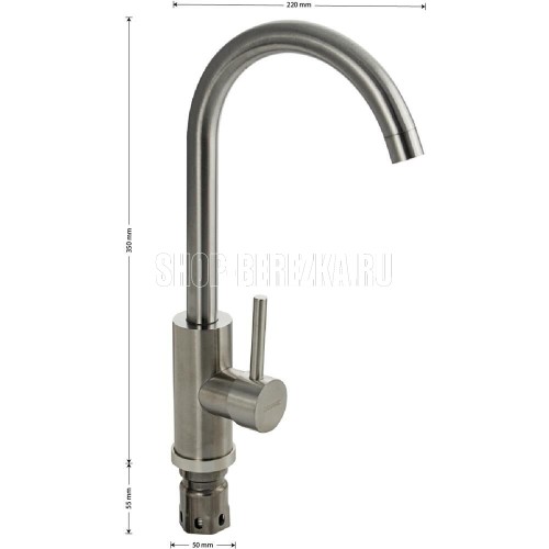 Смеситель для кухонной мойки и раковин, литой матовый корпус, из нержавеющей стали марки 304, с высоким С-образным изливом, шаровый, Крепление резьба - гайка, картридж d = мм, ручка литая. Аэратор для экономии воды. Такая модель может использоваться на домашней кухне, на даче, в медицинских учреждениях и общественных местах. Габаритные размеры: высота 350 мм, длина 220 мм, диаметр посадочного седла 50 мм, длина резьбы 55 мм, длина подводки 500 мм. Вес - 0.98 кг, объём - 0.00516 м3. В комплекте паспорт, корпус с изливом, подводка 1/2, крепеж, набор прокладок.