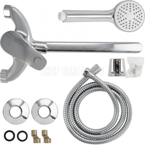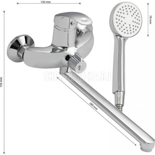 Смеситель хромированный в ванную / душевую комнату с длинным, плоским изливом, изогнутый дутый корпус, шаровый, с дивертором м/к на корпусе. Материал изготовления — ЦАМ (цинк-алюминий-медь) + нержавеющая сталь. Картридж d = 40 мм, ручка литая, аэратор для экономии воды, чашки и эксцентрики. Габаритные размеры: ширина 150 мм, высота корпуса 155 мм, длина излива 280 мм, трёхрежимная душевая лейка d = 78 мм, шланг 150 см. Вес - 1,500 кг, объём - 0,00435 м3. В комплекте паспорт, корпус с изливом, дивертор, душевая лейка, шланг, кронштейн, комплект крепежа и прокладок.