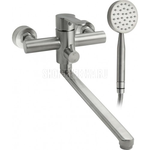Смеситель матовый, из нержавеющей стали марки 304 в ванную / душевую комнату, с поворотным длинным плоским изливом. Картридж d = 35 мм, ручка литая. Дутый, большой круглый корпус с дивертором м/к на корпусе, аэратор для экономии воды, чашки, гайки и эксцентрики из нержавеющей стали. Габаритные размеры: ширина 150 мм, высота 150 мм, длина излива 340 мм, диаметр чашки 60 мм, длина шланга 150 см, лейка d = 85 мм. Вес - 2,400 кг, объём - 0,00865 м3. В комплекте корпус с изливом, дивертор, кронштейн, паспорт, крепёж, прокладки, лейка, шланг.