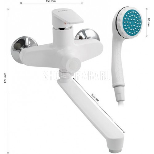 Смеситель из высокопрочного пластика АБС, БЕЛЫЙ в ванную / душевую комнату с длинным, плоским изливом, литой корпус, шаровый с дивертором м/к на корпусе. Картридж d = 40 мм, литая ручка, хромированный, аэратор для экономии воды, хромированные чашки и эксцентрики. Габаритные размеры: ширина 150 мм, высота корпуса 170 мм, длина излива 300 мм, душевая лейка d = 80 мм, шланг 150 см. Вес - 1 350 кг, объём - 0 00700 м3. В комплекте паспорт, корпус с изливом, дивертор, душевая лейка, шланг, кронштейн, комплект крепежа и прокладок.