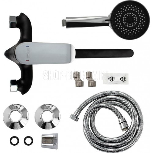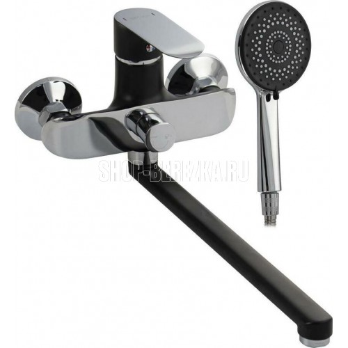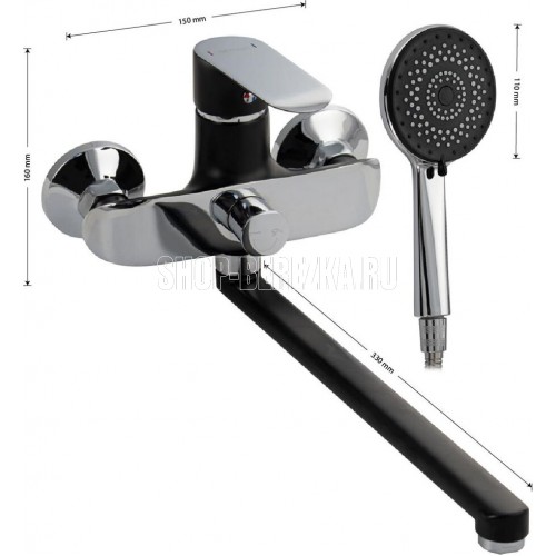 Смеситель комбинированный, чёрная эмаль с хромом в ванную / душевую комнату с длинным плоским изливом, шаровый с дивертором м/к на корпусе. Материал изготовления — ЦАМ (цинк-алюминий-медь) + нержавеющая сталь. Картридж d = 35 мм, литая ручка, аэратор для экономии воды, чашки и эксцентрики из нержавеющей стали. Габаритные размеры: ширина 150 мм, высота корпуса 160 мм, длина излива 330 мм, большая душевая лейка белая с хромированными вставками d = 110 мм, шланг 150 см. Вес - 2,120 кг, объём - 0,008 м3. В комплекте паспорт, корпус с изливом, дивертор, душевая лейка, шланг, кронштейн, комплект крепежа и прокладок.