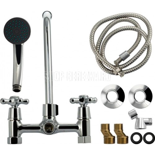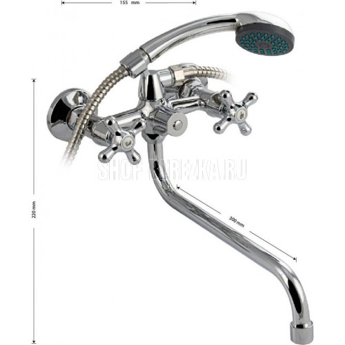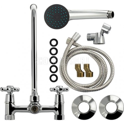 Смеситель хромированный в ванную/душевую комнату с длинным изливом. Материал изготовления — ЦАМ (цинк-алюминий-медь) + нержавеющая сталь. Кранбуксы металлокерамика 1/2, ручки крест поворот на 90?. Дутый, большой корпус с шаровым переключением подачи воды, аэратор для экономии воды, подставка - "рога" для лейки, чашки нержавеющая сталь, гайки и эксцентрики из нержавейки. Габаритные размеры: ширина 150 мм, высота 240 мм, длина излива 350 мм, диаметр чашки 60 мм, длина шланга 150 см, лейка d = 65 мм. Вес - 1,300 кг, объём - 0,00364 м3. В комплекте корпус с изливом, паспорт, крепёж, прокладки, лейка, шланг.