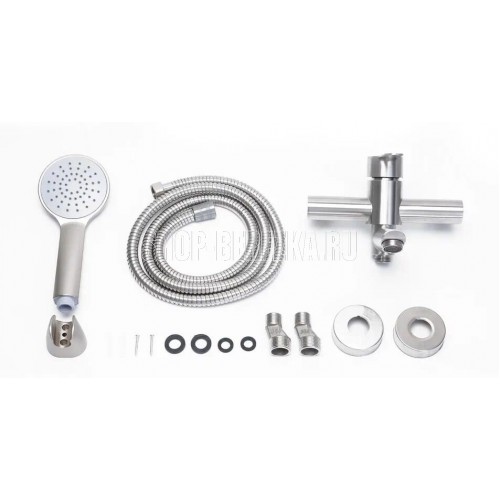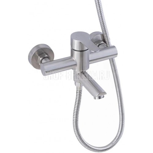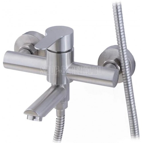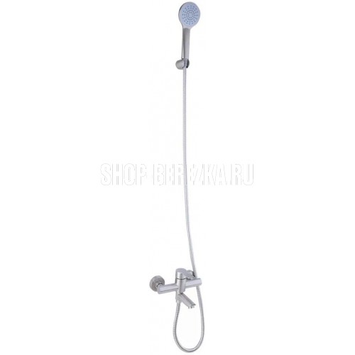 Однорычажный смеситель для ванной с корпусом из латуни, душевой лейкой и длинным изливом. Крепление на эксцентриках, присоединительный размер - G1/2