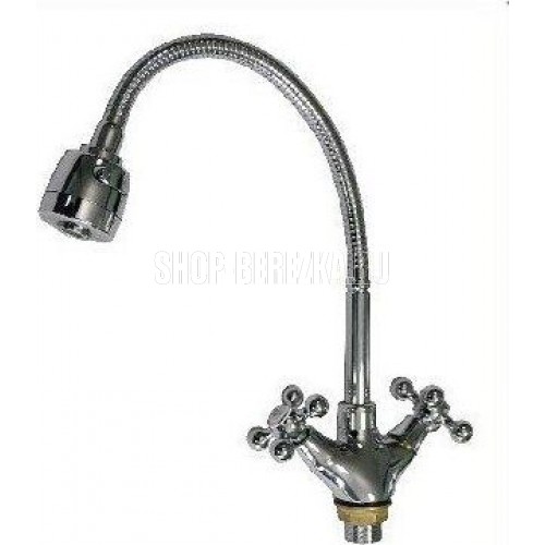 Смеситель для кухонной мойки и раковин, массивный корпус с гибким изливом, хромированный, с двухрежимным аэратором для экономии воды. Материал изготовления — ЦАМ (цинк-алюминий-медь) + нержавеющая сталь. Крепление резьба - гайка. Кранбукса м/к 1/2, ручка крест, поворот на 90?. Габаритные размеры: высота 250 - 310 мм, длина 200 - 250 мм, диаметр посадочного седла 40 мм, длина резьбы 30 мм, длина подводки 350 мм. Вес - 1,400 кг, объём - 0,00500 м3. В комплекте корпус с изливом, паспорт, подводка 1/2, крепёж .
