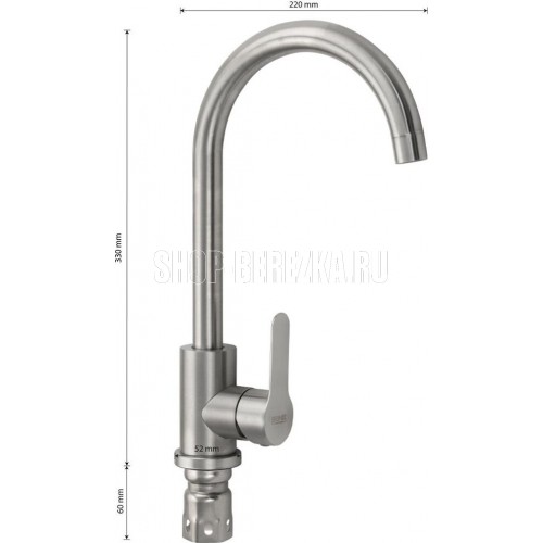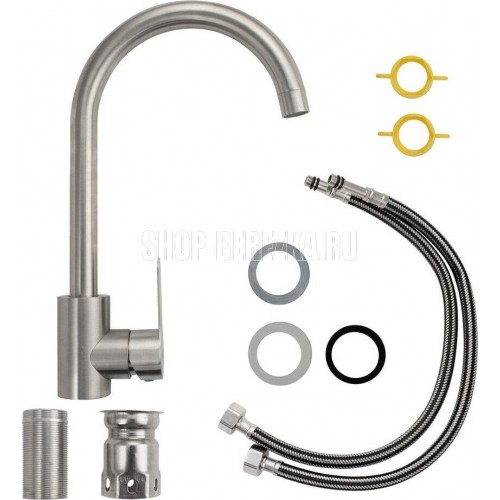 Смеситель для кухонной мойки и раковин, литой матовый корпус, из нержавеющей стали марки 304, с высоким С-образным изливом, шаровый, Крепление резьба - гайка, картридж d = 35 мм, ручка литая. Аэратор для экономии воды. Такая модель может использоваться на домашней кухне, на даче, в медицинских учреждениях и общественных местах. Габаритные размеры: высота 330 мм, длина 220 мм, диаметр посадочного седла 52 мм, длина резьбы 60 мм, длина подводки 450 мм. Вес - 1,45 кг, объём - 0,0057 м3. В комплекте паспорт, корпус с изливом, подводка 1/2, крепеж, набор прокладок.