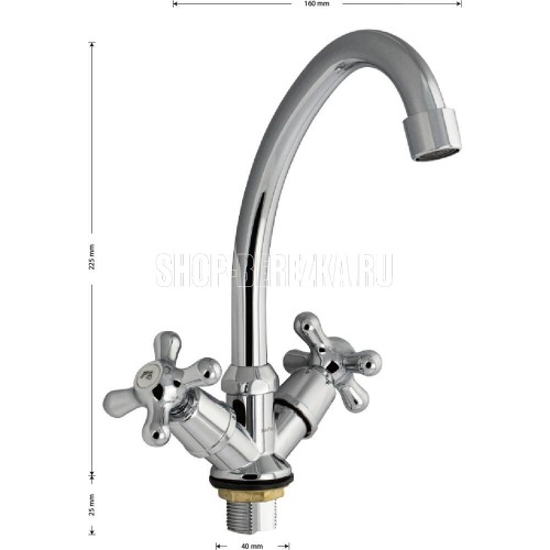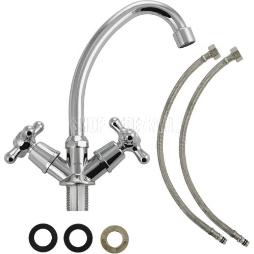 Смеситель для кухонной мойки и раковин, массивный корпус, хромированный, с высоким изливом. В коробке по 2 шт., каждый в инд. упаковке. Материал изготовления — ЦАМ (цинк-алюминий-медь) + нержавеющая сталь. Крепление резьба - гайка. Аэратор для экономии воды. Кранбукса м/к 1/2, ручка крест, поворот на 90?. Габаритные размеры: высота 225 мм, длина 160 мм, диаметр посадочного седла 40 мм, длина резьбы 25 мм, длина подводки 400 мм. Вес - 1,200 кг, объём - 0,00144 м3. В комплекте паспорт, корпус с изливом, подводка 1/2, крепеж, набор прокладок.
