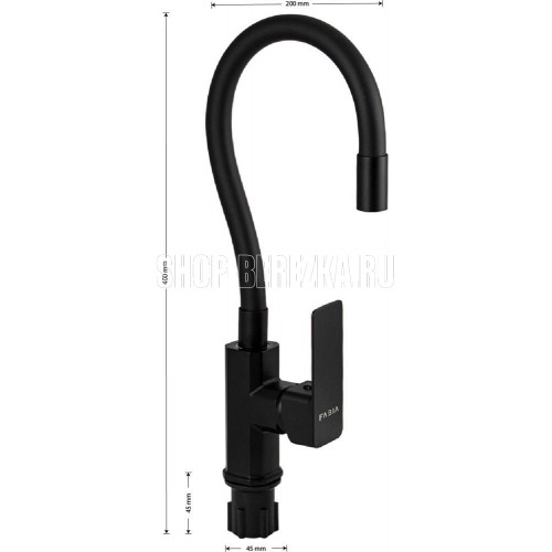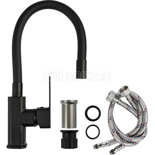Смеситель для кухонной мойки и раковин, черный, боковой, шаровый d = мм, массивный корпус с гибким изливом ч рного цвета, с аэратором для экономии воды. Материал изготовления ЦАМ (цинк-алюминий-медь). Крепление резьба - гайка, литая ручка. Вес - 1.5 кг, объ м - 0.00585 м3. В комплекте корпус с изливом, паспорт, подводка 1/2, креп ж. Габаритные размеры коробки: ширина 200 мм, высота 400 мм, высота резьбы 45 мм, диаметр посадочного седла 45 мм.