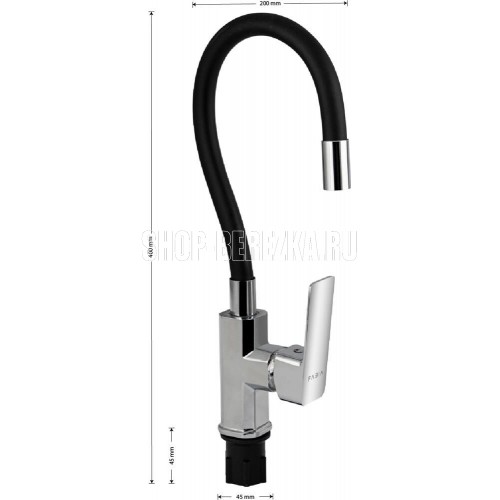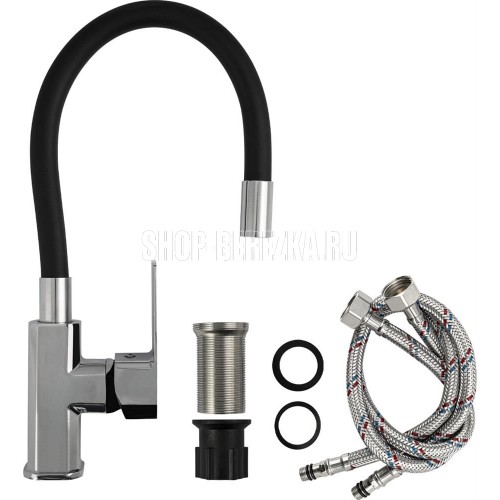 Смеситель для кухонной мойки и раковин, хромированный, боковой, шаровый d = мм, массивный корпус с гибким изливом ч рного цвета, с аэратором для экономии воды. Материал изготовления ЦАМ (цинк-алюминий-медь). Крепление резьба - гайка, литая ручка. Вес - 1.5 кг, объ м - 0.00585 м3. В комплекте корпус с изливом, паспорт, подводка 1/2, креп ж. Габаритные размеры коробки: ширина 200 мм, высота 400 мм, высота резьбы 45 мм, диаметр посадочного седла 45 мм.