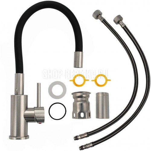 Смеситель для кухонной мойки и раковин, литой матовый корпус, из нержавеющей стали марки 304, с высоким гибким изливом, чёрного цвета, с аэратором для экономии воды, шаровый. Крепление резьба - гайка, картридж d = 25 мм, ручка литая. Такая модель может использоваться на домашней кухне, на даче, в медицинских учреждениях и общественных местах. Габаритные размеры: высота до мм, длина до мм, диаметр посадочного седла мм, длина резьбы 65 мм, длина подводки мм. Вес - 1.28 кг, объём - 0.00385 м3. В комплекте паспорт, корпус с изливом, подводка 1/2, крепеж, набор прокладок.