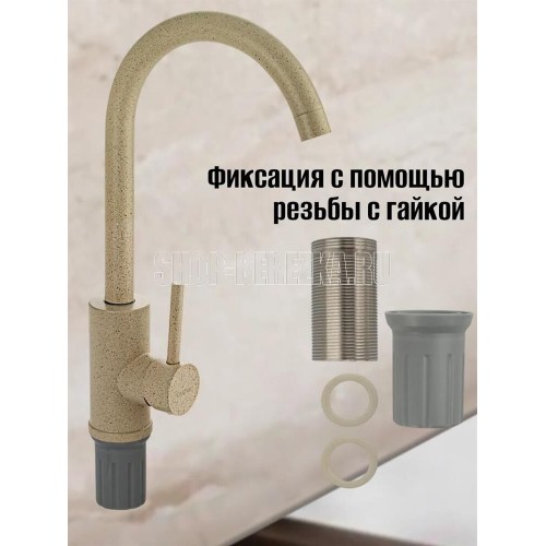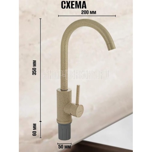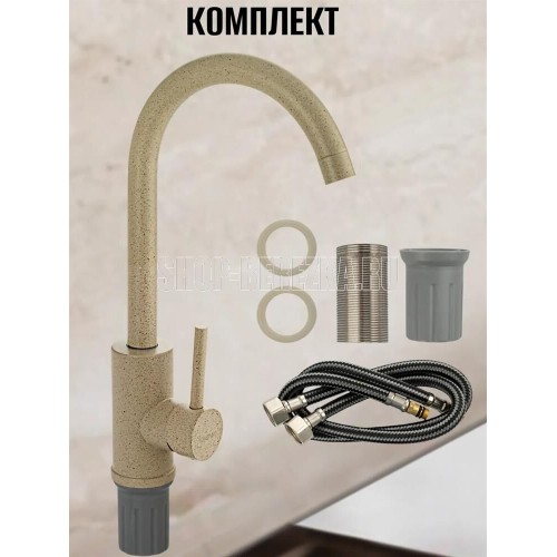 Смеситель для кухонной мойки и раковин, литой матовый корпус, из нержавеющей стали и аллюминия, с высоким С-образным изливом, шаровый,Цвет бежевая эмаль с вкраплениями. Крепление резьба - гайка, картридж d = мм, ручка литая. Аэратор для экономии воды. Такая модель может использоваться на домашней кухне, на даче, в медицинских учреждениях и общественных местах. Габаритные размеры: высота 350 мм, длина 200 мм, диаметр посадочного седла 50 мм, длина резьбы 60 мм, длина подводки 450 мм. Вес - 1.01 кг, объём - 0.00516 м3. В комплекте паспорт, корпус с изливом, подводка 1/2, крепеж, набор прокладок.