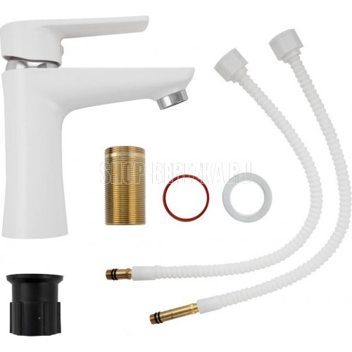 Смеситель для раковины, из высокопрочного пластика АБС, БЕЛЫЙ с коротким изливом, литой корпус, литая ручка, шаровый. Крепление резьба - гайка, картридж d = 40 мм. хромированный, аэратор для экономии воды. Габаритные размеры: высота 160 мм, длина 145 мм, длина излива 105 мм, диаметр посадочного седла 50 мм, длина резьбы 50 мм, длина подводки 400 мм. Вес - 0,600 кг, объём - 0,00417 м3. В комплекте паспорт, корпус, пластиковая подводка с латунными штуцерами 1/2, крепеж, набор прокладок.