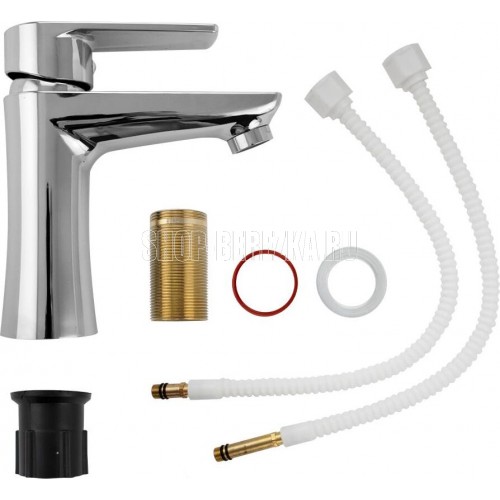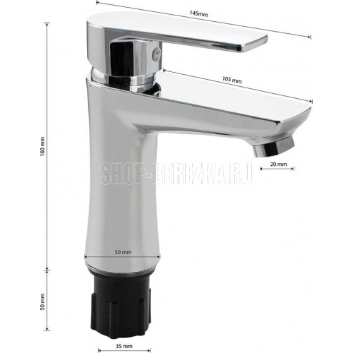Смеситель для раковины, из высокопрочного пластика АБС, ХРОМИРОВАННЫЙ с коротким изливом, литой корпус, литая ручка, шаровый. Крепление резьба - гайка, картридж d = 40 мм, хромированный, аэратор для экономии воды. Габаритные размеры: высота 160 мм, длина 145 мм, длина излива 105 мм, диаметр посадочного седла 50 мм, длина резьбы 50 мм, длина подводки 400 мм. Вес - 0,650 кг, объём - 0,00417 м3. В комплекте паспорт, корпус, пластиковая подводка с латунными штуцерами 1/2, крепеж, набор прокладок.