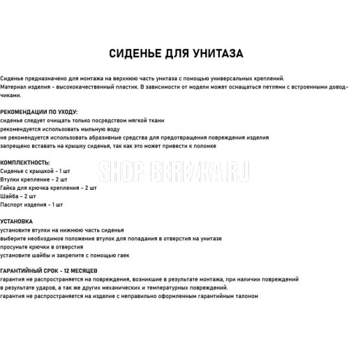 Пластиковое сиденье для унитаза белого цвета классической округлённой формы. Сиденье изготовлено из полипропилена – он обладает высокой износостойкостью, устойчивостью к агрессивным химическим веществам, экологичен и безопасен для здоровья. Специальные амортизаторы обеспечивают плавное и бесшумное закрытие крышки и сиденья унитаза, что предотвращает повреждение поверхности унитаза. Универсальный крепеж: 120-165 мм, входящий в комплект сиденья, позволяют установить его на максимально большое количество моделей унитазов. Не нужно тратить время на дополнительные замеры. Крепления прочно и надежно фиксируют сиденье на унитазе и не расшатываются со временем. Габаритные размеры: длина 430 мм, ширина 355 мм. Вес - 1,500 кг, объём - 0,00851 м3.