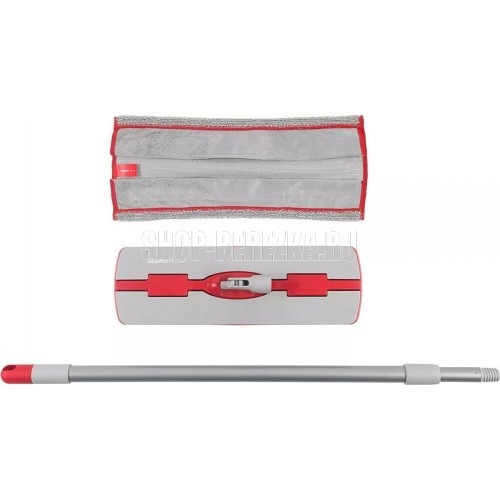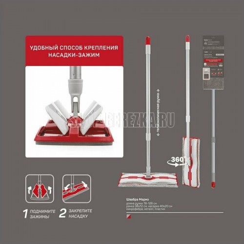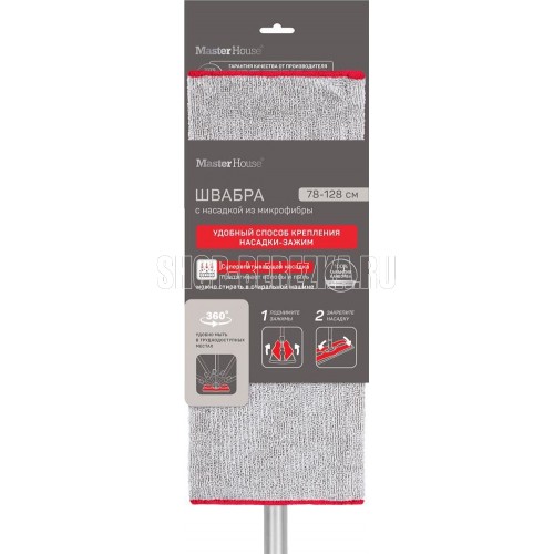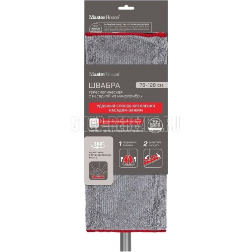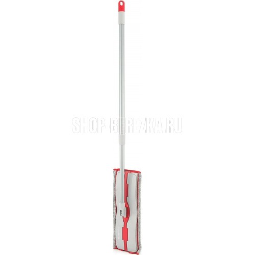Швабра с телескопической металлической окрашенной ручкой, длина ручки 78-128см, вес 340г, основание 38х12см, 250г, с микрофибровой рабочей частью 40х20см, вес 55г, состав сталь, полипропилен, этиленвинилацетат, микрофибра (80% полиэстер, 20% полиамид) цвет: серо-красный, индивидуальная упаковка: картонный подвес, LDPE пакет, 12шт./тр. кор.