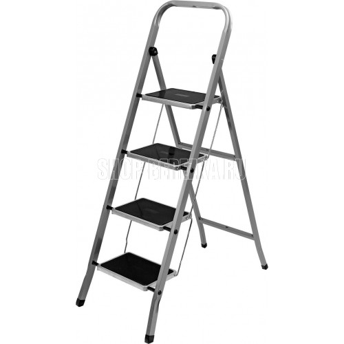 Стремянка стальная Сибртех 97869 имеет 4 ступени с полимерными ковриками и упрощает доступ к предметам и поверхностям, расположенным выше человеческого роста. Лестница легко раскладывается и складывается, а широкое основание придает ей устойчивость. Площадка находится на высоте 92 см от опорной поверхности, рабочая высота стремянки составляет 292 см (при среднем росте пользователя 170 см). Пригодится во время строительства и ремонта, а также будет полезна в быту.Стремянку необходимо устанавливать на ровную плоскость, работа с электроинструментом на ней не допускается.ПреимуществаПрочность — рама и ступени изготовлены из стали, поэтому стремянка выдерживает нагрузку 120 кг.Надежная фиксация в рабочем положении — верхняя площадка имеет специальные зацепы.Безопасность пользователя — на ступенях имеются нескользящие полимерные коврики.Забота о напольном покрытии — ножки с пластиковыми наконечниками не скользят и не оставляют царапин.Удобное хранение — благодаря планке, соединяющей ступени, и шарнирному механизму складывания стремянка в сложенном состоянии очень компактна, ее размеры составляют 1390 х 460 х 65 мм.