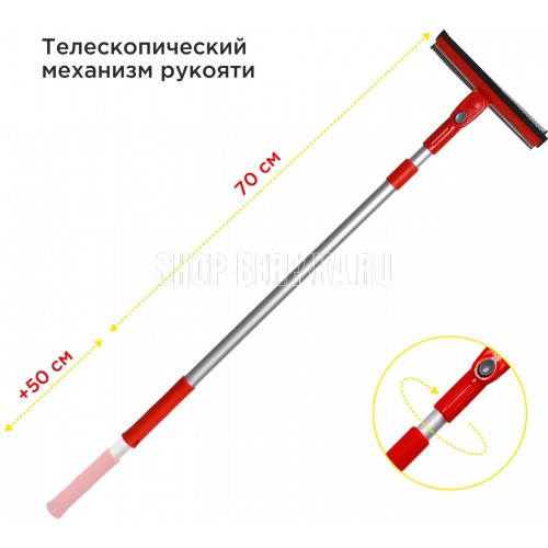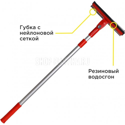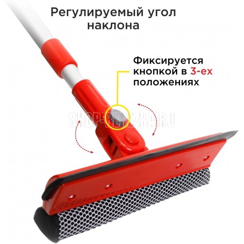 Удобная телескопическая швабра CLIMART предназначена для быстрой и эффективной очистки стекол. Две рабочих поверхности делают швабру универсальной в использовании. Губка с нейлоновой сеткой быстро разрушает и удаляет стойкие загрязнения, а водосгон с эластичным резиновым лезвием собирает излишки воды не оставляя разводов. Телескопическая ручка выдвигается на необходимую длину для удобной очистки труднодоступных поверхностей. Длина швабры в сложенном виде - 75 см, в разложенном - 125 см. Выдвижной механизм оснащен плотным фиксатором, который удерживает заданную длину ручки во время эксплуатации. Благодаря поворотному механизму головка швабры поворачивается на 360 градусов и фиксируется в наиболее удобном для использования положении. Основание рукояти из легкого метала обладает повышенной прочностью и не подвержено коррозии. Эргономичная пластиковая накладка на рукояти не скользит в руке и обеспечивает удобный хват. Особенности • Две функциональных поверхности: губка с нейлоновой сеткой и резиновый водо