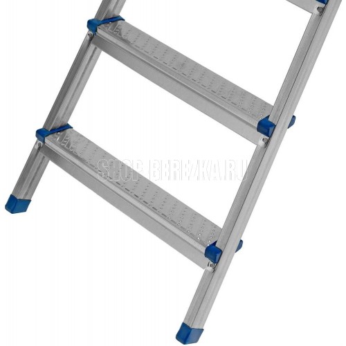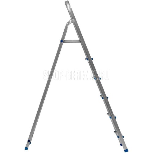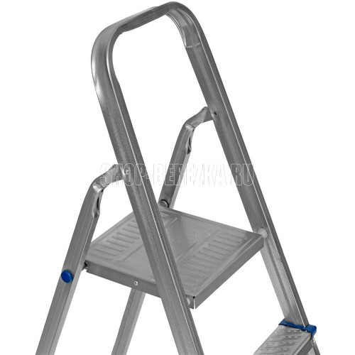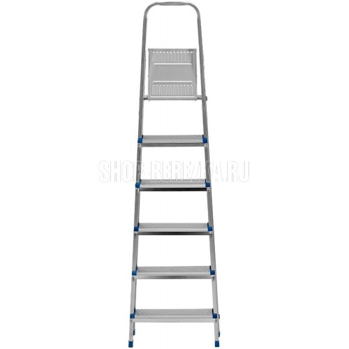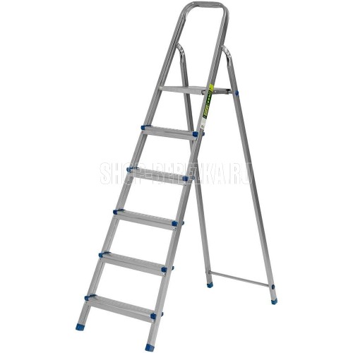 Стальная оцинкованная стремянка Сибртех 97838 с 6 ступенями позволяет повесить полку, картину или шкафчик, достать нужный предмет и решить другие задачи, для которых требуется доступ к предметам на высоте. Рама и ступени из стального профиля выдерживают вес до 120 кг. Расстояние от опорной поверхности до площадки составляет 121 см, при среднем росте пользователя 170 см рабочая высота лестницы — 321 см. Необходимо соблюдать технику безопасности: размещать стремянку только на ровной плоскости и не использовать ее для работы с дрелью, шуруповертом и другим электроинструментом.ПреимуществаПростая установка — на верхней площадке предусмотрены специальные зацепы для фиксации стремянки в разложенном состоянии.Антикоррозийная защита — стальная поверхность оцинкована, что увеличивает срок службы лестницы.Безопасное использование — рифленые ступени обеспечивают противоскользящий эффект, защитные накладки на углах исключают случайное травмирование пользователя.Аккуратное использование — ножки с противоскользящими накладками не повреждают напольное покрытие.Удобная эксплуатация — высокая дуга безопасности позволяет занять устойчивое положение.